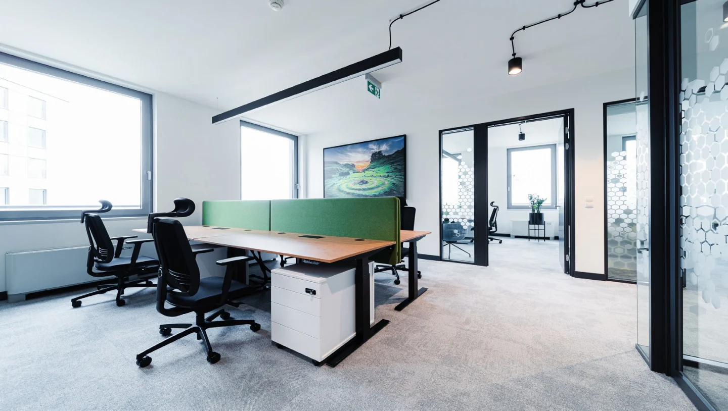 A comprehensive office solution at a competitive price. At myoffice IO-1, we provide fully equipped workstations for €390 per month. This transparent billing model eliminates upfront costs and allows you to focus solely on business development. Whether you need a small office or space for a larger team, our turnkey solutions ensure the highest level of work comfort from day one.
